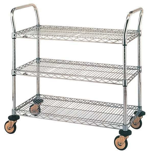 SKU G6488045Categories Material HandlingDescription Utility Cart with Shallow Lipped Wire Shelves, Load Capacity 375 lb, Number of Shelves 3, Shelf Width 18 in, Shelf Length 36 in, Material Steel, Finish Chrome, Caster Wheel Dia. 4 in, Color Silver, Caster Brake Type No Brake Included, Caster Wheel/Tread Material Rubber, Caster/Wheel Configuration (4) Swivel, Distance Between Shelves 10 in, Handle Type (2) Raised, Lip Style 4-Sided Lipped, Shelf Orientation Flat, Collapsible No, Overall Height 38 in, Overall Length 38 in, Overall Width 18 ingraingerSKU: 20W652, mscSKU: , zoro_no: G6488045, mongo_id: 65bbe84d9a749db8227848d5