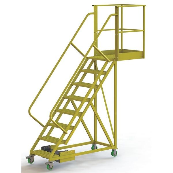 $3,227.49 / eachWeb price122 in H Steel Cantilever Rolling Ladder, 8 StepsSKU G9957771Categories Material HandlingDescription Unsupported, Cantilever Rolling Ladder, Material Steel, Unassembled, Handrails Included Yes, Platform Height 80 in, Platform Width 24 in, Platform Depth 30 in, Overall Height 122 in, Load Capacity 300 lb, Handrail Height 42 in, Bottom Width 30 in, Base Depth 99 in, Number of Steps 8, Climbing Angle 50 Degrees , Ladder Actuation Locking Casters, Step Depth 10 in, Step Width 24 in, Step Tread Serrated, Finish Powder Coated, Color Yellow, Standards OSHA 1910.29 and ANSI A14.7graingerSKU: 15E996, mscSKU: , zoro_no: G9957771, mongo_id: 65bbe6903aaddbd5a903b4d3