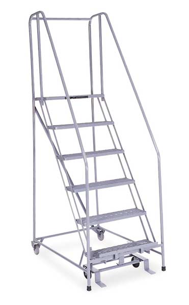 SKU G2138005Categories Material HandlingDescription Rolling Ladder, Material Steel, Platform Height 60 in, Handrails Included Yes, Handrail Height 30 in, Overall Height 90 in, Number of Steps 6, Assembled, Load Capacity 450 lb, Step Tread Expanded Metal, Platform Depth 10 in, Platform Width 24 in, Bottom Width 30 in, Base Depth 46 in, Overall Width 30 in, Climbing Angle 59 Degrees , Step Depth 7 in, Step Width 24 in, Ladder Actuation Foot Activated Step Lock, Finish Powder Coated, Color Gray, Standards ANSI, OSHA, Rear Exit NograingerSKU: 4XM35, mscSKU: , zoro_no: G2138005, mongo_id: 65bbe8289a749db822779521