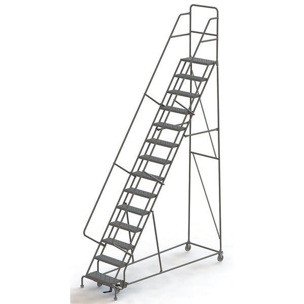$2,282.49 / eachWeb price176 in H Steel Rolling Ladder, 14 StepsSKU G9957595Categories Material HandlingDescription Rolling Ladder, Material Steel, Platform Height 140 in, Handrails Included Yes, Handrail Height 36 in, Overall Height 176 in, Number of Steps 14, Unassembled, Load Capacity 450 lb, Step Tread Perforated, Platform Depth 10 in, Platform Width 24 in, Bottom Width 40 in, Base Depth 103 in, Overall Width 40 in, Climbing Angle 56 Degrees , Step Depth 7 in, Step Width 24 in, Ladder Actuation Foot Activated Step Lock, Finish Powder Coated, Color Gray, Standards ANSI, OSHA, Includes 2-1/2 in Rubber PadsgraingerSKU: 15F022, mscSKU: , zoro_no: G9957595, mongo_id: 65bbe8289a749db8227794c0