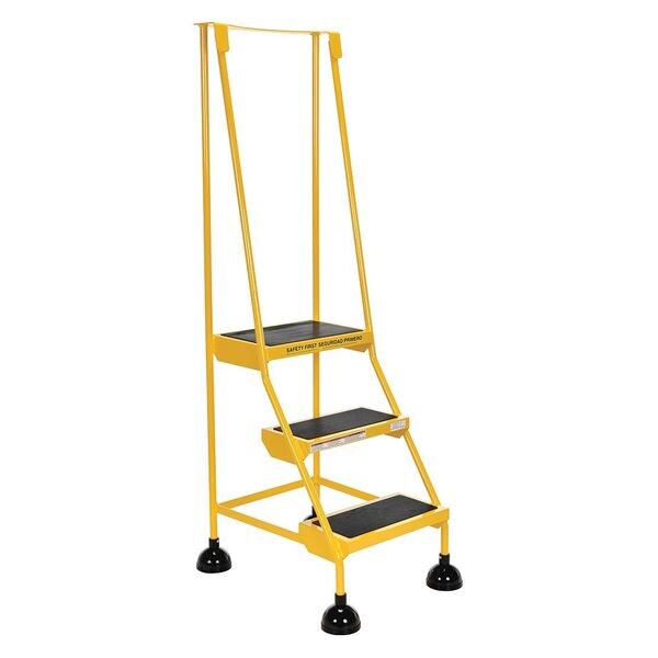 $688.74 / eachWeb price57 in H Steel Rolling Ladder, 3 StepsSKU G6253572Categories Material HandlingDescription Rolling Ladder, Material Steel, Platform Height 27 in, Handrails Included Yes, Handrail Height 30 in, Overall Height 57 in, Number of Steps 3, Unassembled, Load Capacity 450 lb, Step Tread Antislip Vinyl, Platform Depth 14 in, Platform Width 16 in, Bottom Width 24 in, Base Depth 32 in, Overall Width 24 in, Climbing Angle 59 Degrees , Step Depth 8 in, Step Width 16 in, Ladder Actuation Weight Activated Step Lock, Finish Powder Coated, Color Red, Standards ANSI, OSHA, Includes Left HandrailgraingerSKU: 6MXF9, mscSKU: , zoro_no: G6253572, mongo_id: 65bbe6903aaddbd5a903b536