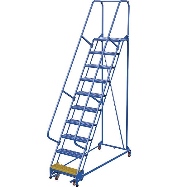 $1,928.74 / eachWeb price130 in H Steel Rolling Ladder, 10 StepsSKU G9929421Categories Material HandlingDescription Rolling Ladder, Material Steel, Platform Height 100 in, Handrails Included Yes, Handrail Height 30 in, Overall Height 130 in, Number of Steps 10, Assembled, Load Capacity 450 lb, Step Tread Expanded Metal, Platform Depth 30 in, Platform Width 24 in, Bottom Width 32 in, Base Depth 92 in, Overall Width 32 in, Climbing Angle 59 Degrees , Step Depth 7 in, Step Width 24 in, Ladder Actuation Foot Activated Step Lock, Finish Powder Coated, Color Gray, Standards ANSI, OSHA, Includes 1 in Crutch TipsgraingerSKU: 20Z439, mscSKU: , zoro_no: G9929421, mongo_id: 65bbe6903aaddbd5a903b50f