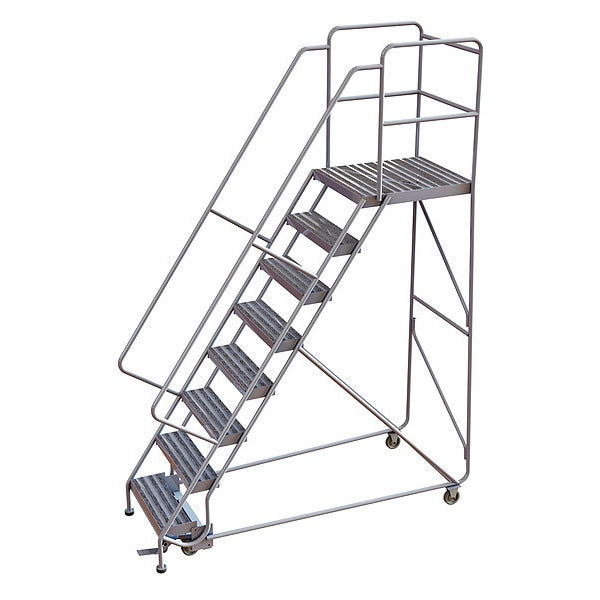SKU G3493211Categories Material HandlingDescription Rolling Ladder, Material Steel, Platform Height 80 in, Handrails Included Yes, Handrail Height 30 in, Overall Height 110 in, Number of Steps 8, Assembled, Load Capacity 450 lb, Step Tread Expanded Metal, Platform Depth 10 in, Platform Width 30 in, Bottom Width 32 in, Base Depth 110 in, Overall Width 32 in, Climbing Angle 59 Degrees , Step Depth 7 in, Step Width 30 in, Ladder Actuation Foot Activated Step Lock, Finish Powder Coated, Color Gray, Standards ANSI, OSHA, Rear Exit NograingerSKU: 21UU10, mscSKU: , zoro_no: G3493211, mongo_id: 65bbe8289a749db822779509