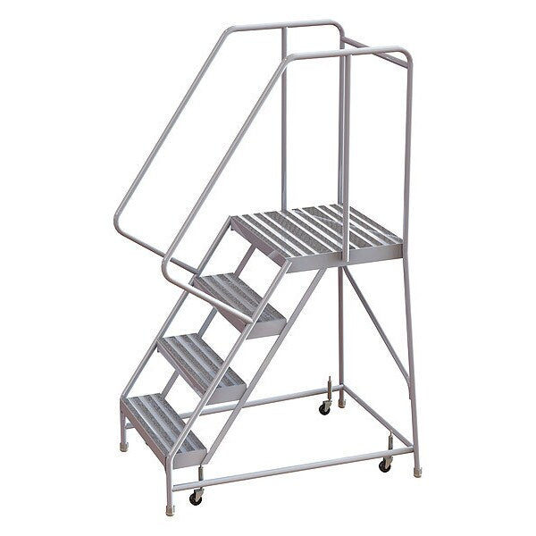 SKU G1000371Categories Material HandlingDescription Tilt and Roll Ladder, Material Steel, Platform Height 40 in, Handrails Included Yes, Handrail Height 30 in, Overall Height 70 in, Number of Steps 4, Assembled, Load Capacity 350 lb, Step Tread Expanded Metal, Platform Depth 20 in, Platform Width 24 in, Bottom Width 28 in, Base Depth 37 in, Overall Width 28 in, Climbing Angle 59 Degrees , Step Depth 7 in, Step Width 24 in, Ladder Actuation None, Finish Powder Coated, Color Gray, Standards ANSI, OSHA, Rear Exit YesgraingerSKU: 21VC79, mscSKU: , zoro_no: G1000371, mongo_id: 65bbe8a322d7a989a99084c0