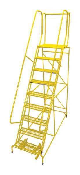 SKU G3492837Categories Material HandlingDescription Rolling Ladder, Material Steel, Platform Height 90 in, Handrails Included Yes, Handrail Height 30 in, Overall Height 120 in, Number of Steps 9, Assembled, Load Capacity 450 lb, Step Tread Perforated, Platform Depth 20 in, Platform Width 24 in, Bottom Width 32 in, Base Depth 120 in, Overall Width 32 in, Climbing Angle 59 Degrees , Step Depth 7 in, Step Width 24 in, Ladder Actuation Foot Activated Step Lock, Finish Powder Coated, Color Yellow, Standards ANSI, OSHA, Rear Exit NograingerSKU: , mscSKU: , zoro_no: G3492837, mongo_id: 65bbe6083aaddbd5a9002195