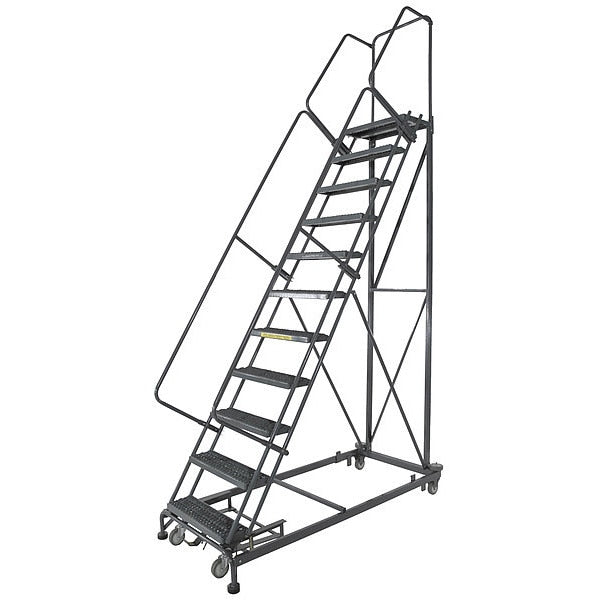 126 in H Steel Tilt and Roll Ladder, 9 StepsSKU G2139588Categories Material HandlingDescription Tilt and Roll Ladder, Material Steel, Platform Height 90 in, Handrails Included Yes, Handrail Height 36 in, Overall Height 126 in, Number of Steps 9, Unassembled, Load Capacity 450 lb, Step Tread Serrated, Platform Depth 10 in, Platform Width 16 in, Bottom Width 37 in, Base Depth 73 1/2 in, Overall Width 37 in, Climbing Angle 56 Degrees , Step Depth 7 in, Step Width 16 in, Ladder Actuation None, Finish Powder Coated, Color Gray, Standards ANSI, OSHA, Includes 10 in Semi-Pneumatic WheelsgraingerSKU: , mscSKU: , zoro_no: G2139588, mongo_id: 65bbe6083aaddbd5a900214e