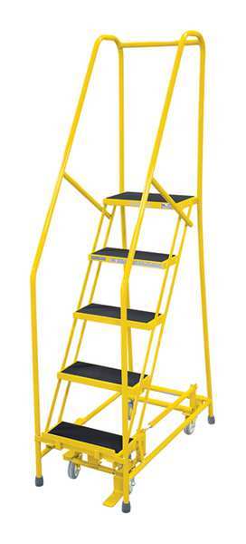 80 in H Steel Rolling Ladder, 5 StepsSKU G0998107Categories Material HandlingDescription Rolling Ladder, Material Steel, Platform Height 50 in, Handrails Included Yes, Handrail Height 30 in, Overall Height 80 in, Number of Steps 5, Unassembled, Load Capacity 450 lb, Step Tread Antislip Vinyl, Platform Depth 10 in, Platform Width 24 in, Bottom Width 31 in, Base Depth 60 in, Overall Width 30 in, Climbing Angle 59 Degrees , Step Depth 7 in, Step Width 24 in, Ladder Actuation Foot Activated Step Lock, Finish Powder Coated, Color Yellow, Standards ANSI, OSHA, Rear Exit NograingerSKU: , mscSKU: , zoro_no: G0998107, mongo_id: 65bbe6f53aaddbd5a90664b9