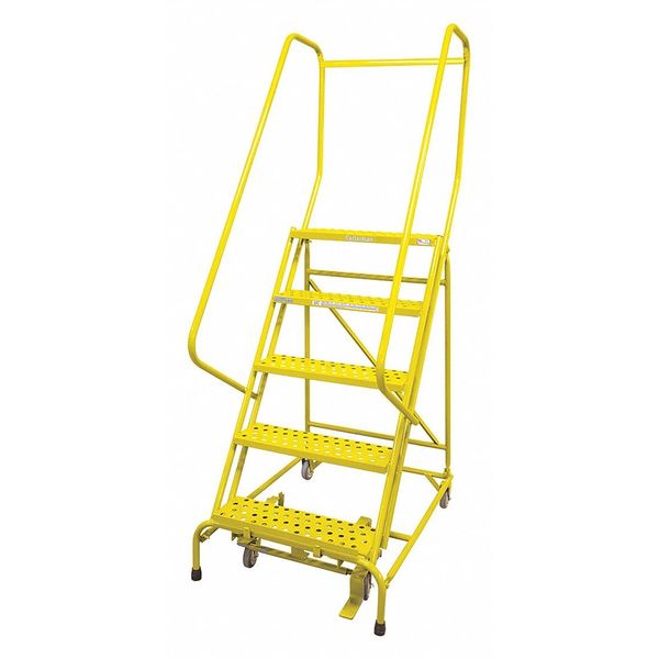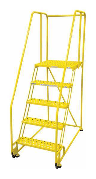 80 in H Steel Tilt and Roll Ladder, 5 StepsSKU G0639171Categories Material HandlingDescription Tilt and Roll Ladder, Material Steel, Platform Height 50 in, Handrails Included Yes, Handrail Height 30 in, Overall Height 80 in, Number of Steps 5, Assembled, Load Capacity 450 lb, Step Tread Perforated, Platform Depth 20 in, Platform Width 24 in, Bottom Width 28 in, Base Depth 53 in, Overall Width 28 in, Climbing Angle 59 Degrees , Step Depth 7 in, Step Width 24 in, Ladder Actuation None, Finish Powder Coated, Color Yellow, Standards ANSI, OSHA, Rear Exit NograingerSKU: , mscSKU: , zoro_no: G0639171, mongo_id: 65bbe6f53aaddbd5a90664ac