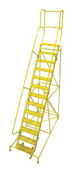 172 in H Steel Rolling Ladder, 13 StepsSKU G3490518Categories Material HandlingDescription Rolling Ladder, Material Steel, Platform Height 130 in, Handrails Included Yes, Handrail Height 42 in, Overall Height 172 in, Number of Steps 13, Unassembled, Load Capacity 450 lb, Step Tread Serrated, Platform Depth 10 in, Platform Width 24 in, Bottom Width 42 in, Base Depth 186 in, Overall Width 44 in, Climbing Angle 59 Degrees , Step Depth 7 in, Step Width 24 in, Ladder Actuation Foot Activated Step Lock, Finish Powder Coated, Color Yellow, Standards ANSI, OSHA, Rear Exit NograingerSKU: , mscSKU: , zoro_no: G3490518, mongo_id: 65bbe6f53aaddbd5a9066498