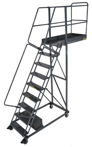 SKU G9851834Categories Material HandlingDescription Rolling Ladder, Material Steel, Platform Height 90 in, Handrails Included Yes, Handrail Height 30 in, Overall Height 123 in, Number of Steps 9, Unassembled, Load Capacity 450 lb, Step Tread Serrated, Platform Depth 14 in, Platform Width 24 in, Bottom Width 32 in, Base Depth 68 in, Overall Width 32 in, Climbing Angle 59 Degrees , Step Depth 7 in, Step Width 24 in, Ladder Actuation Foot Activated Step Lock, Finish Powder Coated, Color Gray, Standards ANSI, OSHAgraingerSKU: , mscSKU: , zoro_no: G9851834, mongo_id: 65bbe6f53aaddbd5a9066473