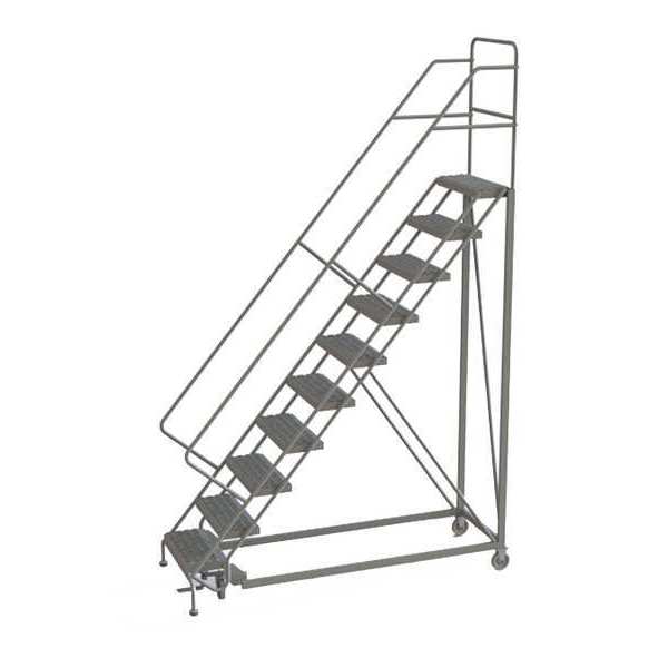 136 in H Steel Rolling Ladder, 10 StepsSKU G2232995Categories Material HandlingDescription Rolling Ladder, Material Steel, Platform Height 100 in, Handrails Included Yes, Handrail Height 36 in, Overall Height 136 in, Number of Steps 10, Unassembled, Load Capacity 450 lb, Step Tread Perforated, Platform Depth 17 in, Platform Width 24 in, Bottom Width 35 in, Base Depth 99 in, Overall Width 35 in, Climbing Angle 50 Degrees , Step Depth 8 1/2 in, Step Width 24 in, Ladder Actuation Foot Activated Step Lock, Finish Powder Coated, Color Gray, Standards ANSI, OSHAgraingerSKU: 25NV52, mscSKU: , zoro_no: G2232995, mongo_id: 65bbe7a79a749db82274e4ca