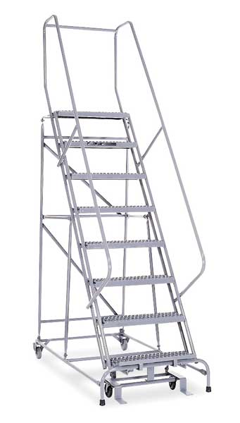 123 in H Steel Rolling Ladder, 9 StepsSKU G6084084Categories Material HandlingDescription Rolling Ladder, Material Steel, Platform Height 90 in, Handrails Included Yes, Handrail Height 30 in, Overall Height 123 in, Number of Steps 9, Unassembled, Load Capacity 450 lb, Step Tread Perforated, Platform Depth 21 in, Platform Width 24 in, Bottom Width 32 in, Base Depth 75 in, Overall Width 32 in, Climbing Angle 59 Degrees , Step Depth 7 in, Step Width 24 in, Ladder Actuation Weight Activated Step Lock, Finish Powder Coated, Color Gray, Standards OSHA/ANSI A14.7$1,802.49 / eachWeb price