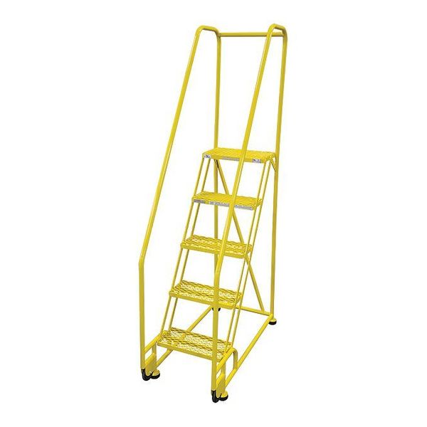80 in H Steel Tilt and Roll Ladder, 5 StepsSKU G1002191Categories Material HandlingDescription Tilt and Roll Ladder, Material Steel, Platform Height 50 in, Handrails Included Yes, Handrail Height 30 in, Overall Height 80 in, Number of Steps 5, Assembled, Load Capacity 450 lb, Step Tread Expanded Metal, Platform Depth 10 in, Platform Width 16 in, Bottom Width 20 in, Base Depth 43 in, Overall Width 20 in, Climbing Angle 59 Degrees , Step Depth 7 in, Step Width 16 in, Ladder Actuation None, Finish Powder Coated, Color Yellow, Standards ANSI, OSHA, Rear Exit NograingerSKU: 21VD45, mscSKU: , zoro_no: G1002191, mongo_id: 65bbe7a79a749db82274e500
