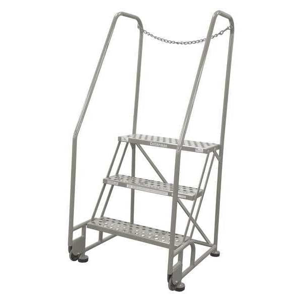 60 in H Steel Tilt and Roll Ladder, 3 StepsSKU G0999726Categories Material HandlingDescription Tilt and Roll Ladder, Material Steel, Platform Height 30 in, Handrails Included Yes, Handrail Height 30 in, Overall Height 60 in, Number of Steps 3, Assembled, Load Capacity 450 lb, Step Tread Perforated, Platform Depth 10 in, Platform Width 24 in, Bottom Width 28 in, Base Depth 31 in, Overall Width 28 in, Climbing Angle 59 Degrees , Step Depth 7 in, Step Width 24 in, Ladder Actuation None, Finish Powder Coated, Color Gray, Standards ANSI, OSHA, Includes Removable Rear Chain, Rear Exit YesgraingerSKU: 21VC13, mscSKU: , zoro_no: G0999726, mongo_id: 65bbe7859a749db822740037