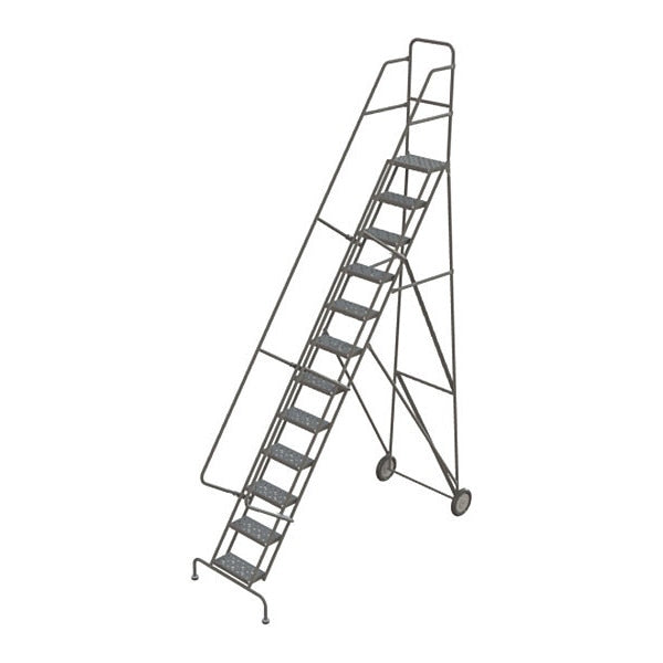 172 in H Steel Rolling Ladder, 13 StepsSKU G3490475Categories Material HandlingDescription Rolling Ladder, Material Steel, Platform Height 130 in, Handrails Included Yes, Handrail Height 42 in, Overall Height 172 in, Number of Steps 13, Unassembled, Load Capacity 450 lb, Step Tread Serrated, Platform Depth 20 in, Platform Width 24 in, Bottom Width 42 in, Base Depth 204 in, Overall Width 44 in, Climbing Angle 59 Degrees , Step Depth 7 in, Step Width 24 in, Ladder Actuation Foot Activated Step Lock, Finish Powder Coated, Color Gray, Standards ANSI, OSHA, Rear Exit NograingerSKU: 21UY70, mscSKU: , zoro_no: G3490475, mongo_id: 65bbe7643aaddbd5a909136f