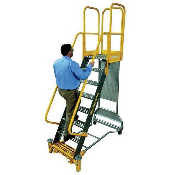80 in H Steel Tilt and Roll Ladder, 5 StepsSKU G1002158Categories Material HandlingDescription Tilt and Roll Ladder, Material Steel, Platform Height 50 in, Handrails Included Yes, Handrail Height 30 in, Overall Height 80 in, Number of Steps 5, Assembled, Load Capacity 350 lb, Step Tread Serrated, Platform Depth 20 in, Platform Width 24 in, Bottom Width 28 in, Base Depth 43 in, Overall Width 28 in, Climbing Angle 59 Degrees , Step Depth 7 in, Step Width 24 in, Ladder Actuation None, Finish Powder Coated, Color Yellow, Standards ANSI, OSHA, Rear Exit NograingerSKU: 21VD40, mscSKU: , zoro_no: G1002158, mongo_id: 65bbe75b9a749db822731aff