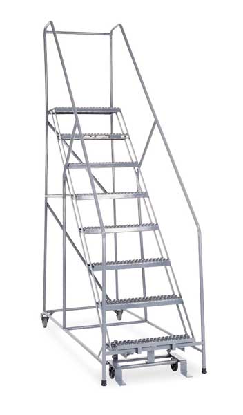 123 in H Steel Rolling Ladder, 9 StepsSKU G9849585Categories Material HandlingDescription Rolling Ladder, Material Steel, Platform Height 90 in, Handrails Included Yes, Handrail Height 30 in, Overall Height 123 in, Number of Steps 9, Unassembled, Load Capacity 450 lb, Step Tread Perforated, Platform Depth 14 in, Platform Width 24 in, Bottom Width 32 in, Base Depth 68 in, Overall Width 32 in, Climbing Angle 59 Degrees , Step Depth 7 in, Step Width 24 in, Ladder Actuation Weight Activated Step Lock, Finish Powder Coated, Color Gray, Standards ANSI, OSHAgraingerSKU: 8DW15, mscSKU: , zoro_no: G9849585, mongo_id: 65bbe73d3aaddbd5a9082f06