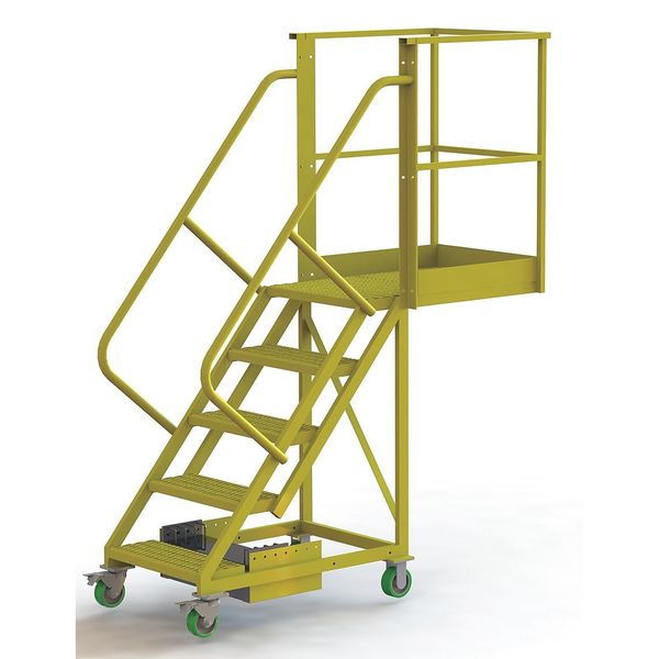 SKU G9957805Categories Material HandlingDescription Unsupported, Cantilever Rolling Ladder, Material Steel, Unassembled, Handrails Included Yes, Platform Height 50 in, Platform Width 24 in, Platform Depth 30 in, Overall Height 92 in, Load Capacity 300 lb, Handrail Height 42 in, Bottom Width 30 in, Base Depth 74 in, Number of Steps 5, Climbing Angle 50 Degrees , Ladder Actuation Locking Casters, Step Depth 10 in, Step Width 24 in, Step Tread Serrated, Finish Powder Coated, Color Yellow, Standards OSHA 1910.29 and ANSI A14.7graingerSKU: 15E993, mscSKU: , zoro_no: G9957805, mongo_id: 65bbe73d3aaddbd5a9082ef7