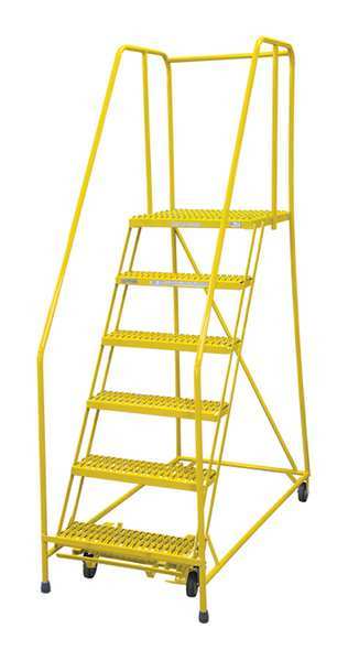 90 in H Steel Rolling Ladder, 6 StepsSKU G0998387Categories Material HandlingDescription Rolling Ladder, Material Steel, Platform Height 60 in, Handrails Included Yes, Handrail Height 30 in, Overall Height 90 in, Number of Steps 6, Unassembled, Load Capacity 450 lb, Step Tread Expanded Metal, Platform Depth 20 in, Platform Width 24 in, Bottom Width 31 in, Base Depth 78 in, Overall Width 30 in, Climbing Angle 59 Degrees , Step Depth 7 in, Step Width 24 in, Ladder Actuation Foot Activated Step Lock, Finish Powder Coated, Color Yellow, Standards ANSI, OSHA, Rear Exit NograingerSKU: 21UW53, mscSKU: , zoro_no: G0998387, mongo_id: 65bbe73d3aaddbd5a9082f45