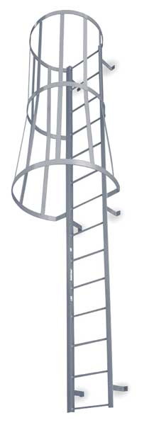 12 ft 3 in Fixed Ladder with Safety Cage, Steel, 13 Steps, Top Exit, Powder Coated FinishSKU G2145687Categories Material HandlingDescription Fixed Ladder with Safety Cage, Walk-Thru Included No, Exit Top, Overall Height 12 ft 3 in, Overall Width 26 in, Material Steel, Load Capacity 300 lb, Number of Steps 13, Top Step Height 12 ft, Rung Dia. 3/4 in, Rung/Step Spacing 12 in, Step Width 16 in, Finish Gray Powder Coated, Standards OSHA and ANSIgraingerSKU: 4EU35, mscSKU: , zoro_no: G2145687, mongo_id: 65bbe73d3aaddbd5a9082f21