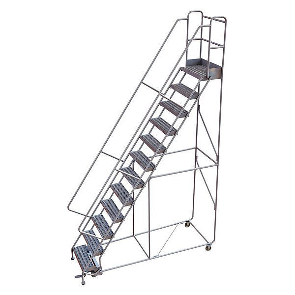 156 in H Steel Rolling Ladder, 12 StepsSKU G9904544Categories Material HandlingDescription Rolling Ladder, Material Steel, Platform Height 120 in, Handrails Included Yes, Handrail Height 36 in, Overall Height 156 in, Number of Steps 12, Unassembled, Load Capacity 600 lb, Step Tread Perforated, Platform Depth 10 in, Platform Width 24 in, Bottom Width 35 in, Base Depth 90 in, Overall Width 35 in, Climbing Angle 56 Degrees , Step Depth 7 in, Step Width 24 in, Ladder Actuation Foot Activated Step Lock, Finish Powder Coated, Color Gray, Standards ANSI, OSHA, Includes 2-1/2 in Rubber PadsgraingerSKU: 2NJW1, mscSKU: , zoro_no: G9904544, mongo_id: 65bbee24526e052139af0a60