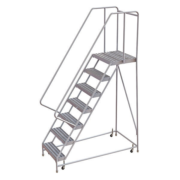 SKU G0980047Categories Material HandlingDescription Rolling Ladder, Material Aluminum, Platform Height 70 in, Handrails Included Yes, Handrail Height 32 in, Overall Height 102 in, Number of Steps 7, Assembled, Load Capacity 350 lb, Step Tread Ribbed, Platform Depth 21 in, Platform Width 16 in, Bottom Width 26 in, Base Depth 64 in, Overall Width 26 in, Climbing Angle 56 Degrees , Step Depth 7 in, Step Width 16 in, Ladder Actuation Spring-Loaded Casters, Finish Aluminum Mill, Color Aluminum, Standards ANSI, OSHA, Includes Crutch TipsgraingerSKU: 25NY37, mscSKU: , zoro_no: G0980047, mongo_id: 65bbee24526e052139af0a59