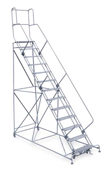SKU G5206708Categories Material HandlingDescription Rolling Ladder, Material Steel, Platform Height 110 in, Handrails Included Yes, Handrail Height 30 in, Overall Height 143 in, Number of Steps 11, Unassembled, Load Capacity 450 lb, Step Tread Expanded Metal, Platform Depth 21 in, Platform Width 24 in, Bottom Width 32 in, Base Depth 87 in, Overall Width 32 in, Climbing Angle 59 Degrees , Step Depth 7 in, Step Width 24 in, Ladder Actuation Weight Activated Step Lock, Finish Powder Coated, Color Gray, Standards ANSI, OSHAgraingerSKU: 41LG34, mscSKU: , zoro_no: G5206708, mongo_id: 65bbee24526e052139af0a6e