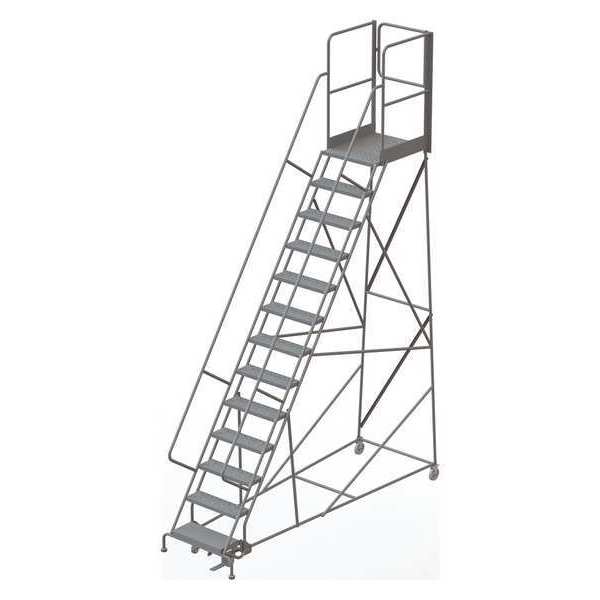 172 in H Steel Rolling Ladder, 13 StepsSKU G3374135Categories Material HandlingDescription Rolling Ladder, Material Steel, Platform Height 130 in, Handrails Included Yes, Handrail Height 42 in, Overall Height 172 in, Number of Steps 13, Unassembled, Load Capacity 450 lb, Step Tread Perforated, Platform Depth 30 in, Platform Width 24 in, Bottom Width 40 in, Base Depth 116 in, Overall Width 40 in, Climbing Angle 56 Degrees , Step Depth 7 in, Step Width 24 in, Ladder Actuation Foot Activated Step Lock, Finish Powder Coated, Color Gray, Standards ANSI, OSHA, Includes Rear-Exit GategraingerSKU: 45FF62, mscSKU: , zoro_no: G3374135, mongo_id: 65bbee24526e052139af0a5f