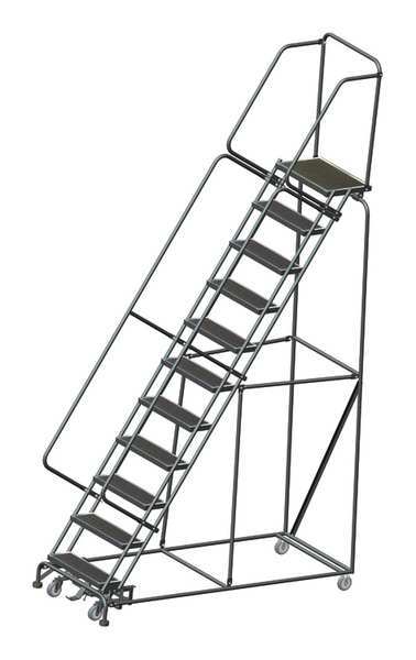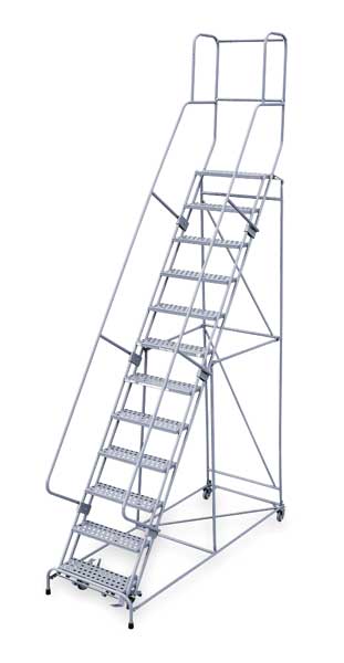 143 in H Steel Rolling Ladder, 11 StepsSKU G9840205Categories Material HandlingDescription Rolling Ladder, Material Steel, Platform Height 110 in, Handrails Included Yes, Handrail Height 30 in, Overall Height 143 in, Number of Steps 11, Unassembled, Load Capacity 450 lb, Step Tread Abrasive Mat, Platform Depth 14 in, Platform Width 24 in, Bottom Width 32 in, Base Depth 80 in, Overall Width 32 in, Climbing Angle 59 Degrees , Step Depth 7 in, Step Width 24 in, Ladder Actuation Weight Activated Step Lock, Finish Powder Coated, Color Gray, Standards ANSI, OSHAgraingerSKU: 9GG25, mscSKU: , zoro_no: G9840205, mongo_id: 65bbedfe526e052139ae24ab