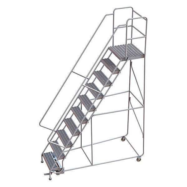 132 in H Aluminum Rolling Ladder, 10 StepsSKU G0980141Categories Material HandlingDescription Rolling Ladder, Material Aluminum, Platform Height 100 in, Handrails Included Yes, Handrail Height 32 in, Overall Height 132 in, Number of Steps 10, Assembled, Load Capacity 350 lb, Step Tread Serrated, Platform Depth 21 in, Platform Width 24 in, Bottom Width 36 in, Base Depth 86 in, Overall Width 36 in, Climbing Angle 56 Degrees , Step Depth 7 in, Step Width 24 in, Ladder Actuation Foot Activated Step Lock, Finish Aluminum Mill, Color Aluminum, Standards ANSI, OSHAgraingerSKU: 25NY64, mscSKU: , zoro_no: G0980141, mongo_id: 65bbedfe526e052139ae2486