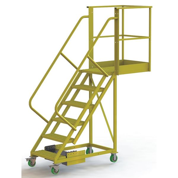SKU G9957841Categories Material HandlingDescription Unsupported, Cantilever Rolling Ladder, Material Steel, Unassembled, Handrails Included Yes, Platform Height 60 in, Platform Width 24 in, Platform Depth 30 in, Overall Height 102 in, Load Capacity 300 lb, Handrail Height 42 in, Bottom Width 30 in, Base Depth 82 in, Number of Steps 6, Climbing Angle 50 Degrees , Ladder Actuation Locking Casters, Step Depth 8 1/2 in, Step Width 24 in, Step Tread Perforated, Finish Powder Coated, Color Yellow, Standards OSHA 1910.29 and ANSI A14.7graingerSKU: 15E989, mscSKU: , zoro_no: G9957841, mongo_id: 65bbea4a22d7a989a99a61ad
