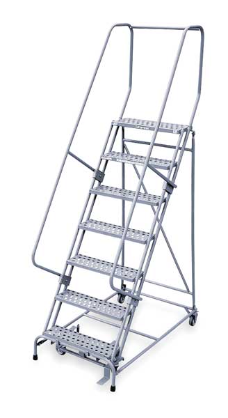 100 in H Steel Rolling Ladder, 7 StepsSKU G9852832Categories Material HandlingDescription Rolling Ladder, Material Steel, Platform Height 70 in, Handrails Included Yes, Handrail Height 30 in, Overall Height 100 in, Number of Steps 7, Unassembled, Load Capacity 450 lb, Step Tread Antislip Vinyl, Platform Depth 10 in, Platform Width 24 in, Bottom Width 30 in, Base Depth 53 in, Overall Width 30 in, Climbing Angle 59 Degrees , Step Depth 7 in, Step Width 24 in, Ladder Actuation Foot Activated Step Lock, Finish Powder Coated, Color Gray, Standards ANSI, OSHA, Rear Exit NograingerSKU: 6ZEV1, mscSKU: , zoro_no: G9852832, mongo_id: 65bbe98822d7a989a995e55e