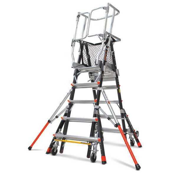 SKU G9504862Categories Material HandlingDescription Safety Cage Platform Ladder, Ladder Height 5 to 9 ft, Platform Width 18 in, Platform Depth 22 in, Platform Height 5 to 9 ft, Load Capacity 375 lb, Bottom Width 45 1/2 in, Base Spread 56 in to 88 in, Material Fiberglass, Series Adjustable Safety Cage, Number of Steps 5 to 9, Step Depth 1 1/2 in 1 3/4 in, Step Tread Ribbed, Rung/Step Spacing 12 in, ANSI Type IAA, Includes Net, Outriggers, Wheel Lift, Standards OSHA and ANSI 14.5, Net Weight 125 lbgraingerSKU: 36GL23, mscSKU: , zoro_no: G9504862, mongo_id: 65bbe98822d7a989a995e58c