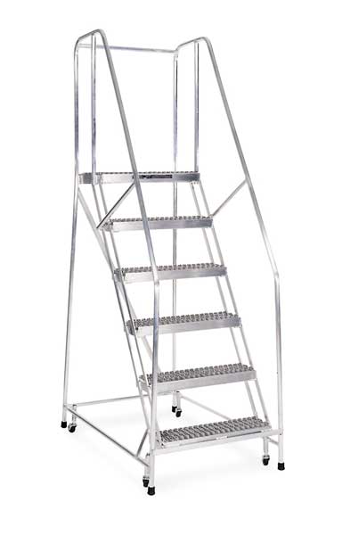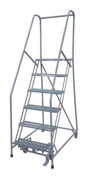 90 in H Steel Rolling Ladder, 6 StepsSKU G0998439Categories Material HandlingDescription Rolling Ladder, Material Steel, Platform Height 60 in, Handrails Included Yes, Handrail Height 30 in, Overall Height 90 in, Number of Steps 6, Unassembled, Load Capacity 450 lb, Step Tread Serrated, Platform Depth 10 in, Platform Width 24 in, Bottom Width 30 in, Base Depth 96 in, Overall Width 30 in, Climbing Angle 59 Degrees , Step Depth 7 in, Step Width 24 in, Ladder Actuation Foot Activated Step Lock, Finish Powder Coated, Color Gray, Standards ANSI, OSHA, Rear Exit NograingerSKU: 21UW60, mscSKU: , zoro_no: G0998439, mongo_id: 65bbe9f322d7a989a99897d9