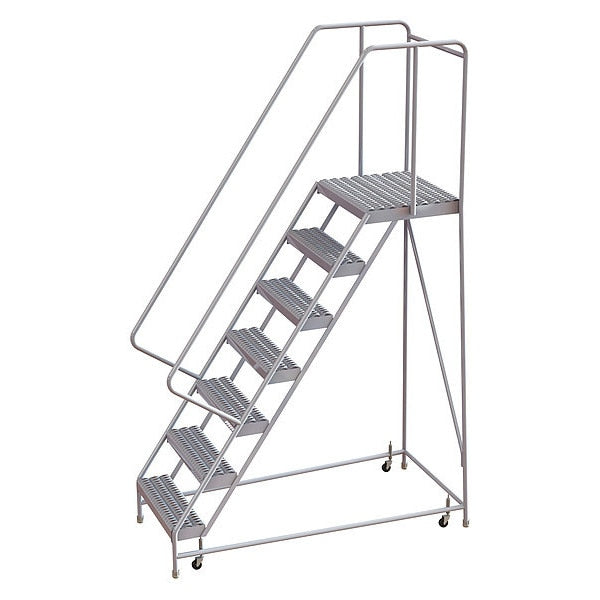 102 in H Aluminum Rolling Ladder, 7 StepsSKU G0980065Categories Material HandlingDescription Rolling Ladder, Material Aluminum, Platform Height 70 in, Handrails Included Yes, Handrail Height 32 in, Overall Height 102 in, Number of Steps 7, Assembled, Load Capacity 350 lb, Step Tread Serrated, Platform Depth 21 in, Platform Width 16 in, Bottom Width 26 in, Base Depth 64 in, Overall Width 26 in, Climbing Angle 56 Degrees , Step Depth 7 in, Step Width 16 in, Ladder Actuation Spring-Loaded Casters, Finish Aluminum Mill, Color Aluminum, Standards ANSI, OSHA, Includes Crutch TipsgraingerSKU: 25NY40, mscSKU: , zoro_no: G0980065, mongo_id: 65bbe9f322d7a989a998979c