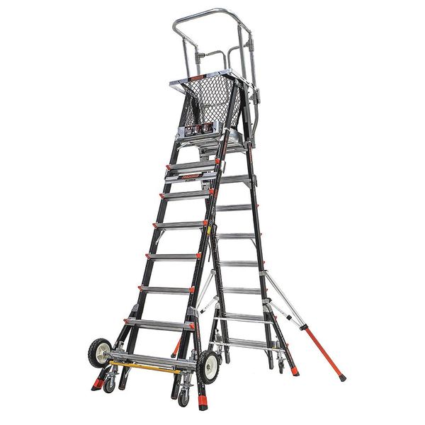 SKU G3892607Categories Material HandlingDescription Safety Cage Platform Ladder, Ladder Height 8 to 14 ft, Platform Width 18 in, Platform Depth 22 in, Platform Height 8 to 14 ft, Load Capacity 375 lb, Bottom Width 45 1/2 in, Base Spread 128 in, Material Fiberglass, Series Adjustable Safety Cage, Number of Steps 8 to 14, Step Depth 1 1/2 in 1 3/4 in, Step Tread Ribbed, Rung/Step Spacing 12 in, ANSI Type IAA, Includes All-Terrain Wheels, Net, Outriggers, Wheel Lift, Standards OSHA and ANSI 14.5, Net Weight 157 lbgraingerSKU: 48WJ61, mscSKU: , zoro_no: G3892607, mongo_id: 65bbe9cb22d7a989a997b2b1