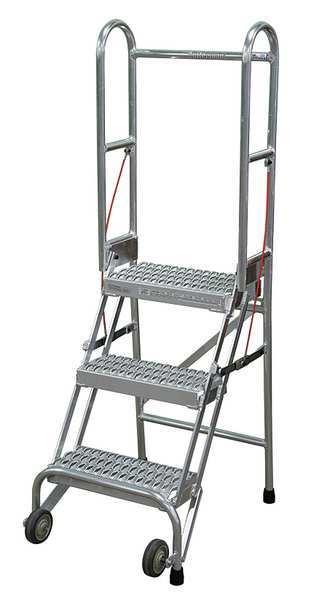 60 in H Aluminum Folding Rolling Ladder, 3 StepsSKU G7115001Categories Material HandlingDescription Folding Rolling Ladder, Material Aluminum, Platform Height 30 in, Handrails Included Yes, Handrail Height 30 in, Overall Height 60 in, Number of Steps 3, Assembled, Load Capacity 350 lb, Step Tread Serrated, Platform Depth 10 in, Platform Width 16 in, Bottom Width 20 in, Base Depth 28 in, Overall Width 20 in, Climbing Angle 59 Degrees , Step Depth 7 in, Step Width 16 in, Ladder Actuation None, Finish Aluminum Acid Brightened, Color Natural, Standards ANSI, OSHAgraingerSKU: 46C362, mscSKU: , zoro_no: G7115001, mongo_id: 65bbe9cb22d7a989a997b278