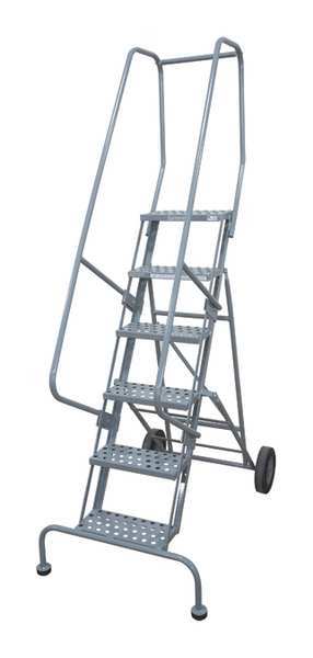 96 in H Steel Stock Picking Rolling Ladder, 6 StepsSKU G9900317Categories Material HandlingDescription Stock Picking Rolling Ladder, Material Steel, Platform Height 60 in, Handrails Included Yes, Handrail Height 36 in, Overall Height 96 in, Number of Steps 6, Unassembled, Load Capacity 450 lb, Step Tread Perforated, Platform Depth 20 in, Platform Width 24 in, Bottom Width 35 in, Base Depth 60 in, Overall Width 35 in, Climbing Angle 56 Degrees , Step Depth 7 in, Step Width 24 in, Ladder Actuation Foot Activated Step Lock, Finish Powder Coated, Color Gray, Standards ANSI, OSHAgraingerSKU: 31DW28, mscSKU: , zoro_no: G9900317, mongo_id: 65bbe9cb22d7a989a997b235
