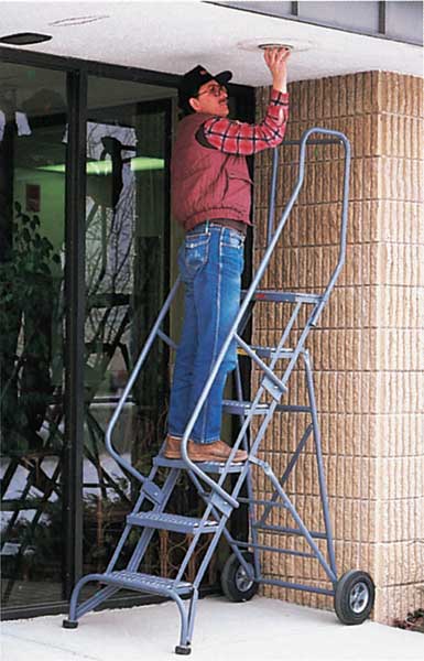 90 in H Steel Rolling Ladder, 6 StepsSKU G0997188Categories Material HandlingDescription Rolling Ladder, Material Steel, Platform Height 60 in, Handrails Included Yes, Handrail Height 30 in, Overall Height 90 in, Number of Steps 6, Assembled, Load Capacity 450 lb, Step Tread Serrated, Platform Depth 30 in, Platform Width 30 in, Bottom Width 32 in, Base Depth 66 in, Overall Width 32 in, Climbing Angle 59 Degrees , Step Depth 7 in, Step Width 30 in, Ladder Actuation Foot Activated Step Lock, Finish Powder Coated, Color Gray, Standards ANSI, OSHA, Rear Exit NograingerSKU: 21UT15, mscSKU: , zoro_no: G0997188, mongo_id: 65bbe9cb22d7a989a997b297