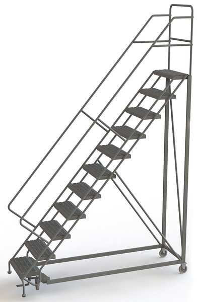 146 in H Steel Configurable Rolling Ladder, 11 StepsSKU G9906784Categories Material HandlingDescription Configurable Rolling Ladder, Material Steel, Platform Height 110 in, Handrails Included Yes, Handrail Height 36 in, Overall Height 146 in, Number of Steps 11, Unassembled, Load Capacity 450 lb, Step Tread Serrated, Platform Depth 17 in, Platform Width 24 in, Bottom Width 35 in, Base Depth 107 in, Overall Width 35 in, Climbing Angle 50 Degrees , Step Depth 8 1/2 in, Step Width 24 in, Ladder Actuation Foot Activated Step Lock, Finish Powder Coated, Color Gray, Standards ANSI, OSHAgraingerSKU: 29RJ45, mscSKU: , zoro_no: G9906784, mongo_id: 65bbe98022d7a989a995e513