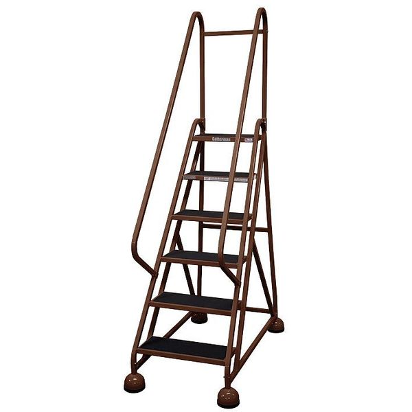 84 in H Steel Rolling Ladder, 6 StepsSKU G9808373Categories Material HandlingDescription Rolling Ladder, Material Steel, Platform Height 54 in, Handrails Included Yes, Handrail Height 30 in, Overall Height 84 in, Number of Steps 6, Unassembled, Load Capacity 450 lb, Step Tread Antislip Vinyl, Platform Depth 14 in, Platform Width 16 in, Bottom Width 27 in, Base Depth 53 in, Overall Width 27 in, Climbing Angle 59 Degrees , Step Depth 8 in, Step Width 16 in, Ladder Actuation Weight Activated Step Lock, Finish Powder Coated, Color Brown, Standards ANSI, OSHA, Includes Double HandrailsgraingerSKU: 6MXL8, mscSKU: , zoro_no: G9808373, mongo_id: 65bbe9a522d7a989a996cc59