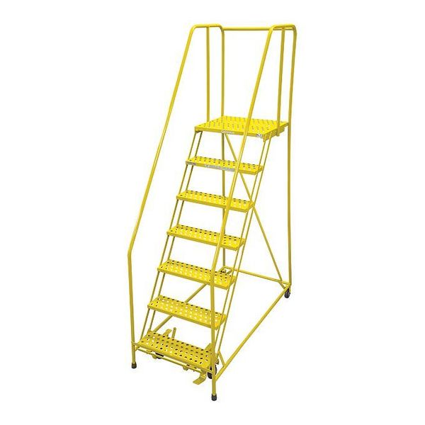 SKU G0638900Categories Material HandlingDescription Rolling Ladder, Material Steel, Platform Height 70 in, Handrails Included Yes, Handrail Height 30 in, Overall Height 100 in, Number of Steps 7, Assembled, Load Capacity 450 lb, Step Tread Serrated, Platform Depth 20 in, Platform Width 24 in, Bottom Width 30 in, Base Depth 63 in, Overall Width 30 in, Climbing Angle 59 Degrees , Step Depth 7 in, Step Width 24 in, Ladder Actuation Foot Activated Step Lock, Finish Powder Coated, Color Yellow, Standards ANSI, OSHA, Rear Exit NograingerSKU: 21UT47, mscSKU: , zoro_no: G0638900, mongo_id: 65bbe9a522d7a989a996cc54