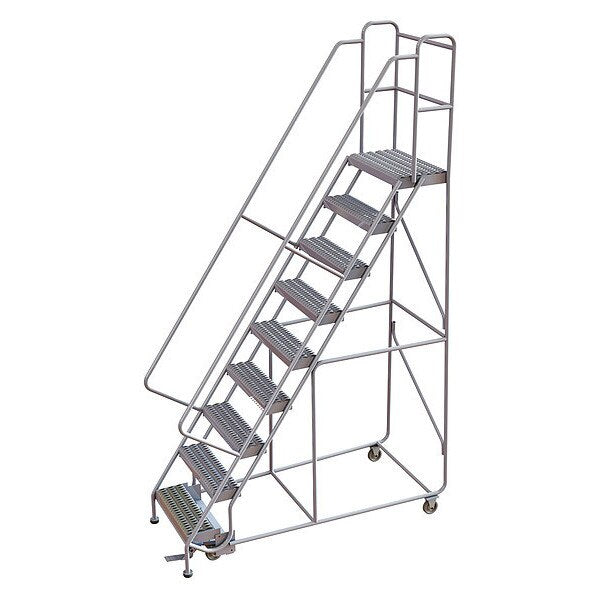 122 in H Aluminum Rolling Ladder, 9 StepsSKU G0978629Categories Material HandlingDescription Rolling Ladder, Material Aluminum, Platform Height 90 in, Handrails Included Yes, Handrail Height 32 in, Overall Height 122 in, Number of Steps 9, Assembled, Load Capacity 350 lb, Step Tread Serrated, Platform Depth 14 in, Platform Width 24 in, Bottom Width 36 in, Base Depth 72 in, Overall Width 36 in, Climbing Angle 56 Degrees , Step Depth 7 in, Step Width 24 in, Ladder Actuation Foot Activated Step Lock, Finish Aluminum Mill, Color Aluminum, Standards ANSI, OSHA, Includes 2-1/2 in Rubber PadsgraingerSKU: 25NY57, mscSKU: , zoro_no: G0978629, mongo_id: 65bbe9a522d7a989a996cc19