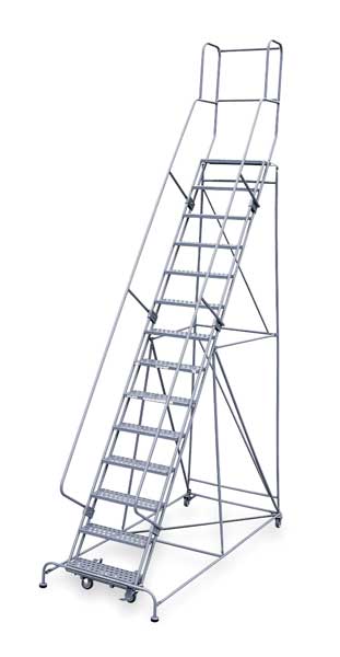 182 in H Steel Rolling Ladder, 14 StepsSKU G9931153Categories Material HandlingDescription Rolling Ladder, Material Steel, Platform Height 140 in, Handrails Included Yes, Handrail Height 42 in, Overall Height 182 in, Number of Steps 14, Unassembled, Load Capacity 450 lb, Step Tread Expanded Metal, Platform Depth 20 in, Platform Width 24 in, Bottom Width 42 in, Base Depth 111 in, Overall Width 42 in, Climbing Angle 59 Degrees , Step Depth 7 in, Step Width 24 in, Ladder Actuation Foot Activated Step Lock, Finish Powder Coated, Color Gray, Standards ANSI, OSHAgraingerSKU: 20Z228, mscSKU: , zoro_no: G9931153, mongo_id: 65bbe9a522d7a989a996cc3d