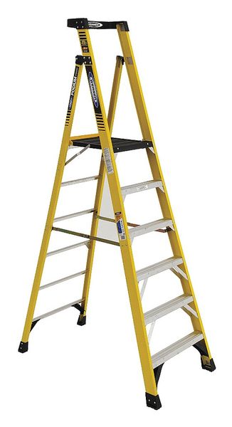 SKU G9477614Categories Material HandlingDescription Podium Stepladder, Ladder Height 9 ft, Platform Width 16 in, Platform Depth 19 1/2 in, Platform Height 6 ft, Load Capacity 375 lb, Bottom Width 31 in, Base Spread 56 in, Material Fiberglass, Series PD7300, Number of Steps 6, Step Depth 3 in, Step Tread Ribbed, Rung/Step Spacing 12 in, ANSI Type IAA, Includes EDGE Bracing, Extra Large Platform with Toe Guard, Waist High Plastic Guard Rail with Slots for Accessories, Standards ANSI, Net Weight 39.4 lbgraingerSKU: 36FX52, mscSKU: 91588038, zoro_no: G9477614, mongo_id: 65bbe9a522d7a989a996cbf2