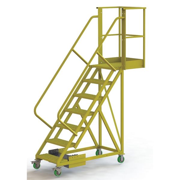 SKU G9957884Categories Material HandlingDescription Unsupported, Cantilever Rolling Ladder, Material Steel, Unassembled, Handrails Included Yes, Platform Height 70 in, Platform Width 24 in, Platform Depth 20 in, Overall Height 112 in, Load Capacity 300 lb, Handrail Height 42 in, Bottom Width 30 in, Base Depth 81 in, Number of Steps 7, Climbing Angle 50 Degrees , Ladder Actuation Locking Casters, Step Depth 10 in, Step Width 24 in, Step Tread Serrated, Finish Powder Coated, Color Yellow, Standards OSHA 1910.29 and ANSI A14.7graingerSKU: 15E985, mscSKU: , zoro_no: G9957884, mongo_id: 65bbe9a522d7a989a996cc09