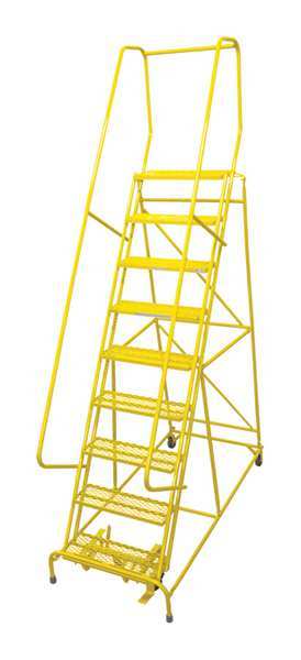 SKU G3493010Categories Material HandlingDescription Rolling Ladder, Material Steel, Platform Height 90 in, Handrails Included Yes, Handrail Height 30 in, Overall Height 120 in, Number of Steps 9, Assembled, Load Capacity 450 lb, Step Tread Antislip Vinyl, Platform Depth 10 in, Platform Width 24 in, Bottom Width 32 in, Base Depth 120 in, Overall Width 32 in, Climbing Angle 59 Degrees , Step Depth 7 in, Step Width 24 in, Ladder Actuation Foot Activated Step Lock, Finish Powder Coated, Color Yellow, Standards ANSI, OSHA, Rear Exit NograingerSKU: 21UU38, mscSKU: , zoro_no: G3493010, mongo_id: 65bbe7183aaddbd5a9074a5a