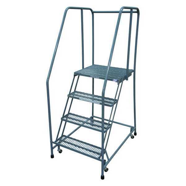 70 in H Steel Rolling Ladder, 4 StepsSKU G0998816Categories Material HandlingDescription Rolling Ladder, Material Steel, Platform Height 40 in, Handrails Included Yes, Handrail Height 30 in, Overall Height 70 in, Number of Steps 4, Unassembled, Load Capacity 450 lb, Step Tread Perforated, Platform Depth 30 in, Platform Width 16 in, Bottom Width 21 in, Base Depth 60 in, Overall Width 21 in, Climbing Angle 59 Degrees , Step Depth 7 in, Step Width 16 in, Ladder Actuation Foot Activated Step Lock, Finish Powder Coated, Color Gray, Standards ANSI, OSHA, Rear Exit NograingerSKU: 21UV89, mscSKU: , zoro_no: G0998816, mongo_id: 65bbe7183aaddbd5a9074a58