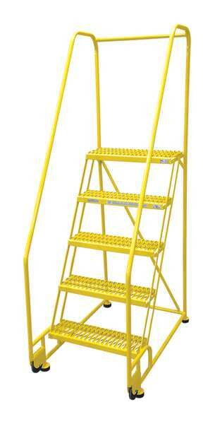 80 in H Steel Tilt and Roll Ladder, 5 StepsSKU G1000231Categories Material HandlingDescription Tilt and Roll Ladder, Material Steel, Platform Height 50 in, Handrails Included Yes, Handrail Height 30 in, Overall Height 80 in, Number of Steps 5, Assembled, Load Capacity 450 lb, Step Tread Serrated, Platform Depth 20 in, Platform Width 16 in, Bottom Width 20 in, Base Depth 53 in, Overall Width 20 in, Climbing Angle 59 Degrees , Step Depth 7 in, Step Width 16 in, Ladder Actuation None, Finish Powder Coated, Color Yellow, Standards ANSI, OSHA, Rear Exit NograingerSKU: 21VD51, mscSKU: , zoro_no: G1000231, mongo_id: 65bbe7183aaddbd5a9074a7a