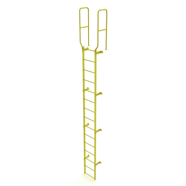 17 ft. 6" Ladder, Walk-Thru Fixed, Steel, 15-Rung, Steel, 15 Steps, Safety Yellow FinishSKU G2281857Categories Material HandlingDescription Fixed Ladder, Walk-Thru Included Yes, Exit Top, Overall Height 18 ft, Overall Width 28 in, Material Steel, Load Capacity 450 lb, Number of Steps 15, Top Step Height 14 ft, Rung Dia. 3/4 in, Rung/Step Spacing 12 in, Step Width 18 in, Finish Safety Yellow, Standards ANSI; OSHA Compliant, Includes 42 In. guardrails, Manufacturers Warranty Length 1 yrgraingerSKU: 231F08, mscSKU: , zoro_no: G2281857, mongo_id: 65bbe7183aaddbd5a9074a29